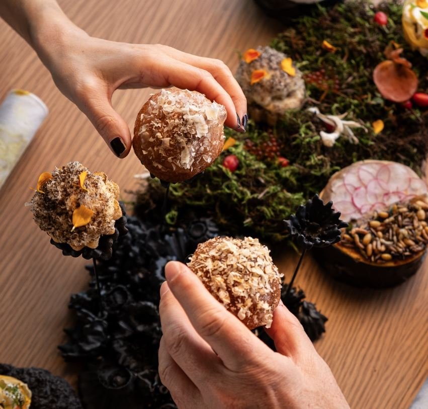 Στο τραπέζι φτάνει μία πίτα με κολοκύθα, αρωματισμένη με δυόσμο και πάνω ένα τριαντάφυλλο από τυρί κατσικίσιο που φτιάχνουν στο Nyn Esti, μέσα σε ένα κεραμικό πιάτο που φέρει σχηματισμούς λουλουδιών τα οποία ψήθηκαν μέσα στον πηλό. Ακολουθούν μικρές πίτσες με αλμυρή γκρανόλα, πιπεριά φλωρίνης και ραπανάκι μέσα σε μια φωλιά. Μετά, λουκουμάδες με γέμιση από καβούρι και από πάνω μαύρη τρούφα σαν γλυφιτζούρια στερεωμένα σε μια μεταλλική βάση με λουλούδια.