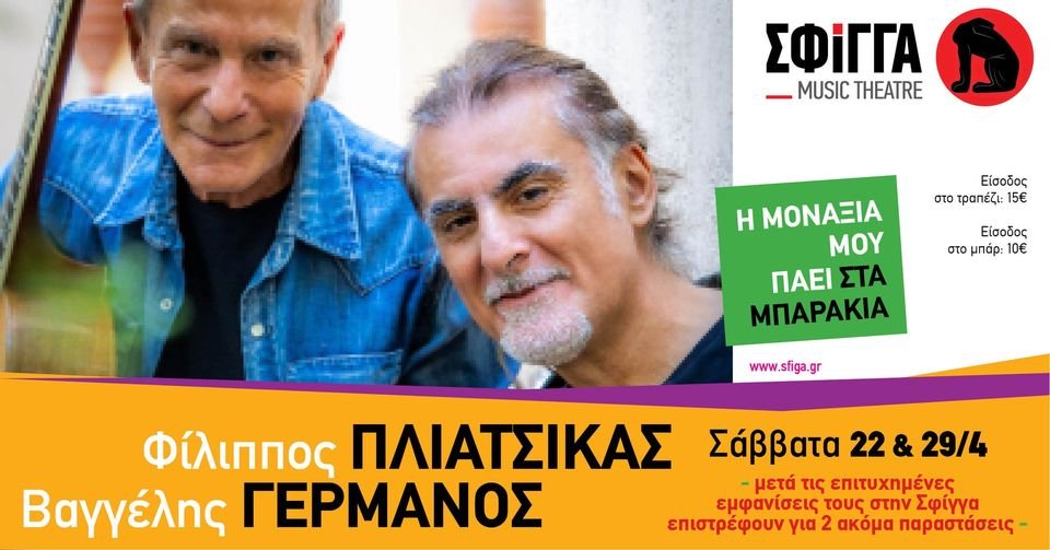 Ο Φίλιππος Πλιάτσικας και ο Βαγγέλης Γερμανός επιστρέφουν στην Σφίγγα για δύο ακόμα παραστάσεις, τα Σάββατα 22 και 29 Απριλίου, παρουσιάζοντας την μουσική παράσταση «Η Μοναξιά μου πάει στα Μπαράκια».