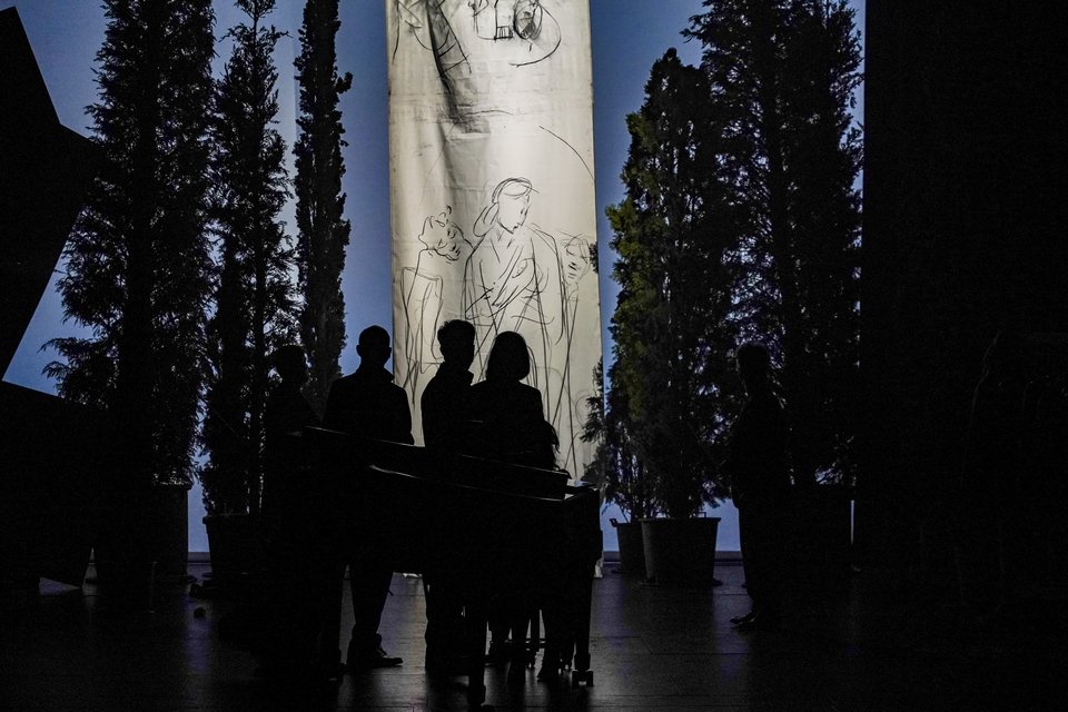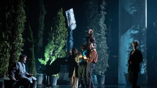 Το χειροκρότημα είναι ζεστό στο τέλος, αλλά όχι εκρηκτικό. Στην αυλή που βρίσκεται στην καρδιά του κτιρίου με φωτισμένα βιτρό να δημιουργούν μια μορφή σκηνικού, είναι πολλοί οι Ιταλοί που γκουγκλάρουν να μάθουν στοιχεία για τον Χαλεπά, πίνοντας Aperol. Να ενώσουν ψηφίδες. Και ίσως να νιώσουν ξεκάθαρα αυτό που είδαν. Μέσα στη σκηνή, ανάμεσα σε καπνούς ακόμα στέκει ο κήπος με τα πανύψηλα δέντρα που έστησε η Εφη Μπίρμπα, σαν σκοτεινό νορβηγικό δάσος, το Αιγαίο και η αίσθηση του νησιού και της ελευθερίας απουσιάζουν. Αληθινά φυτά που θα μεταφυτευτούν σε πάρκα στη συνέχεια, διαβάζω.