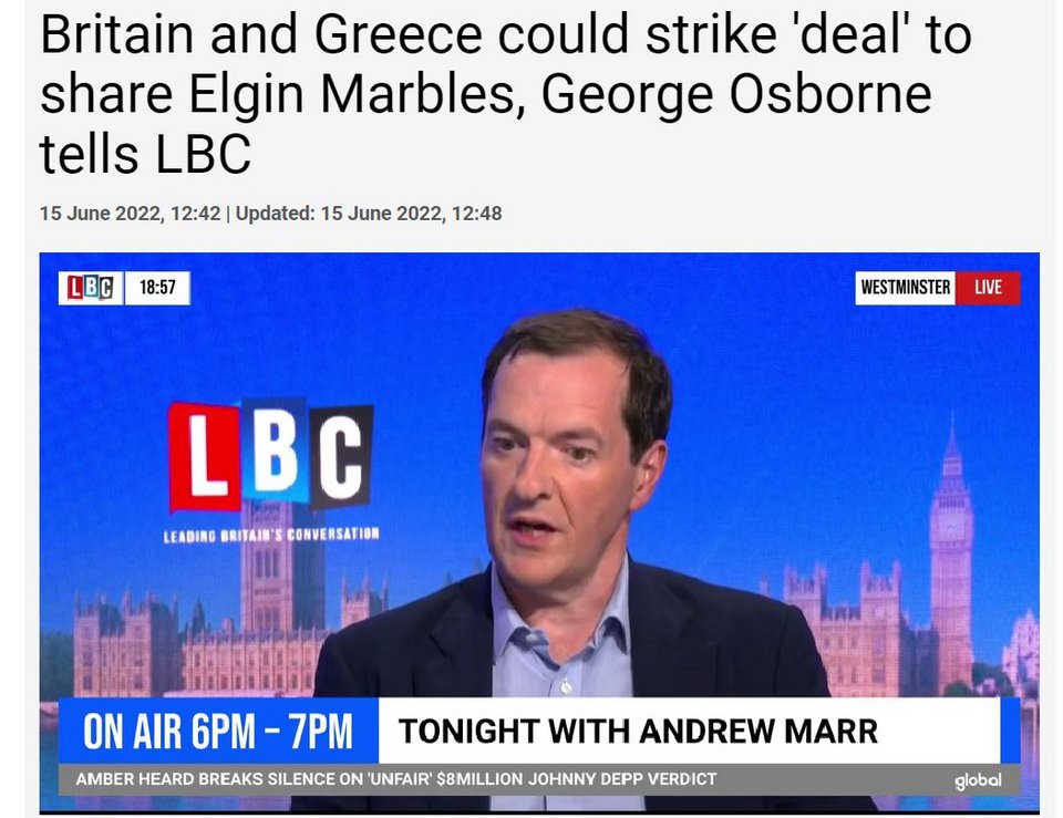 O πρόεδρος του Βρετανικού Μουσείου, Τζορτζ Οσμπορν -ο πρώην υπουργός Οικονομικών γνωστός ως υπουργός λιτότητας του Κάμερον- δήλωσε στο δίκτυο LBC ότι θα μπορούσε να επιτευχθεί «μεταξύ λογικών ανθρώπων» μια συμφωνία για να μοιραστούν τα Γλυπτά το Μουσείο της Ακρόπολης και το Βρετανικό Μουσείο.