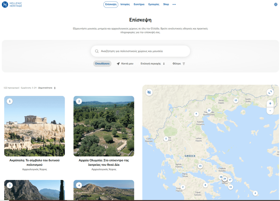 Στον πυρήνα του έργου βρίσκεται η νέα ψηφιακή πλατφόρμα hh.gr, η οποία συγκεντρώνει για πρώτη φορά πολιτιστικούς χώρους σε έναν ενιαίο ψηφιακό προορισμό.