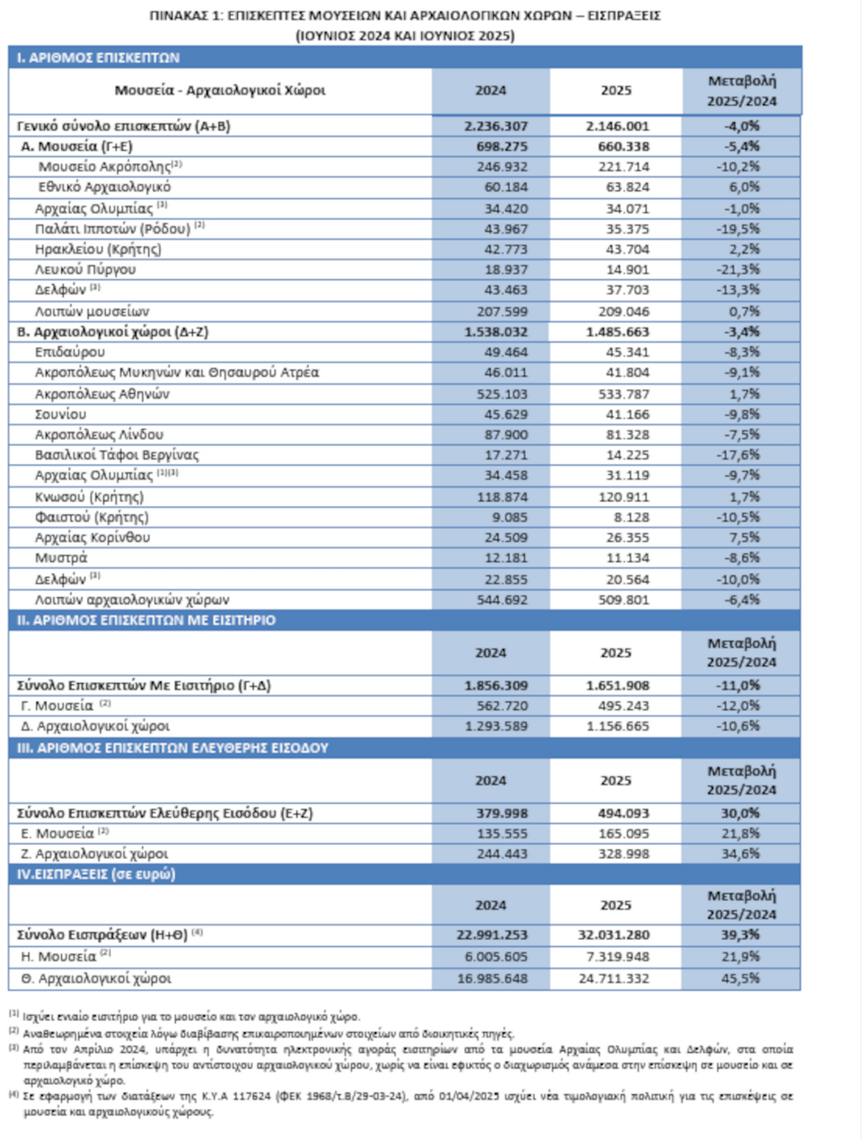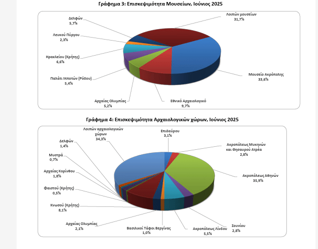 Σύμφωνα επίσης με την ΕΛΣΤΑΤ, στους αρχαιολογικούς χώρους, τον Ιούνιο 2025 σε σύγκριση με τον αντίστοιχο μήνα του 2024, καταγράφεται μείωση των επισκεπτών κατά 3,4%, αύξηση των επισκεπτών ελεύθερης εισόδου κατά 34,6% και αύξηση των εισπράξεων κατά 45,5%.