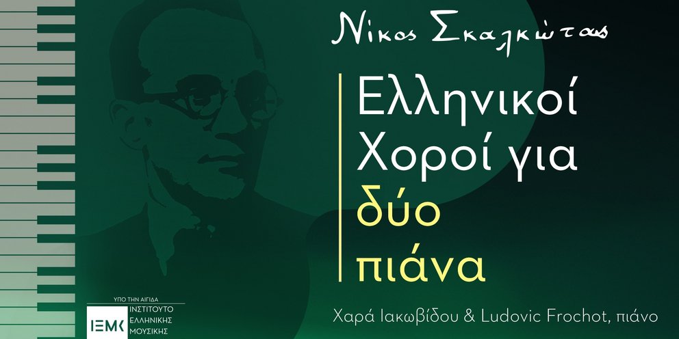 Το εμβληματικό έργο του σπουδαίου δημιουργού, «Ελληνικοί Χοροί για Ορχήστρα», παρουσιάζεται για πρώτη φορά σε μεταγραφή για δύο πιάνα, η οποία αποδίδει με μοναδικό τρόπο τη συμφωνική σκέψη, τον πλούτο και την πολυπλοκότητα της γραφής του Σκαλκώτα. Ο πυρήνας της συναυλίας αποτελείται από 12 διάσημους Ελληνικούς Χορούς, οι οποίοι πλαισιώνονται από έργα των Γ. Κωνσταντινίδη, M. Infante και B. Bartók, καθώς και από δύο σύγχρονες δημιουργίες του Φ. Τσαλαχούρη, τοποθετώντας το έργο του Σκαλκώτα στο ευρύτερο ελληνικό και διεθνές καλλιτεχνικό πλαίσιο. Την ιδέα και την υλοποίηση υπογράφουν οι πιανίστες Χαρά Ιακωβίδου και Ludovic Frochot, οι οποίοι προσέγγισαν το έργο με σεβασμό και δεξιοτεχνία.