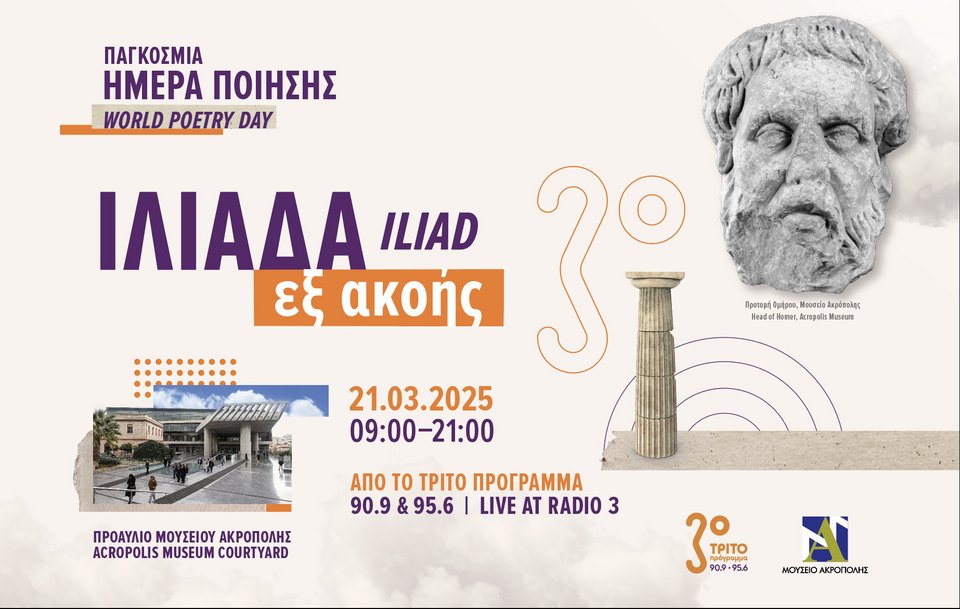 Με την ευκαιρία της Παγκόσμιας Ημέρας Ποίησης, την Παρασκευή 21/3 το Μουσείο Ακρόπολης προσκαλεί σε μαραθώνια συνακρόαση του ομηρικού έπους της Ιλιάδας, την οποία διοργανώνει το Τρίτο Πρόγραμμα της ΕΡΤ.