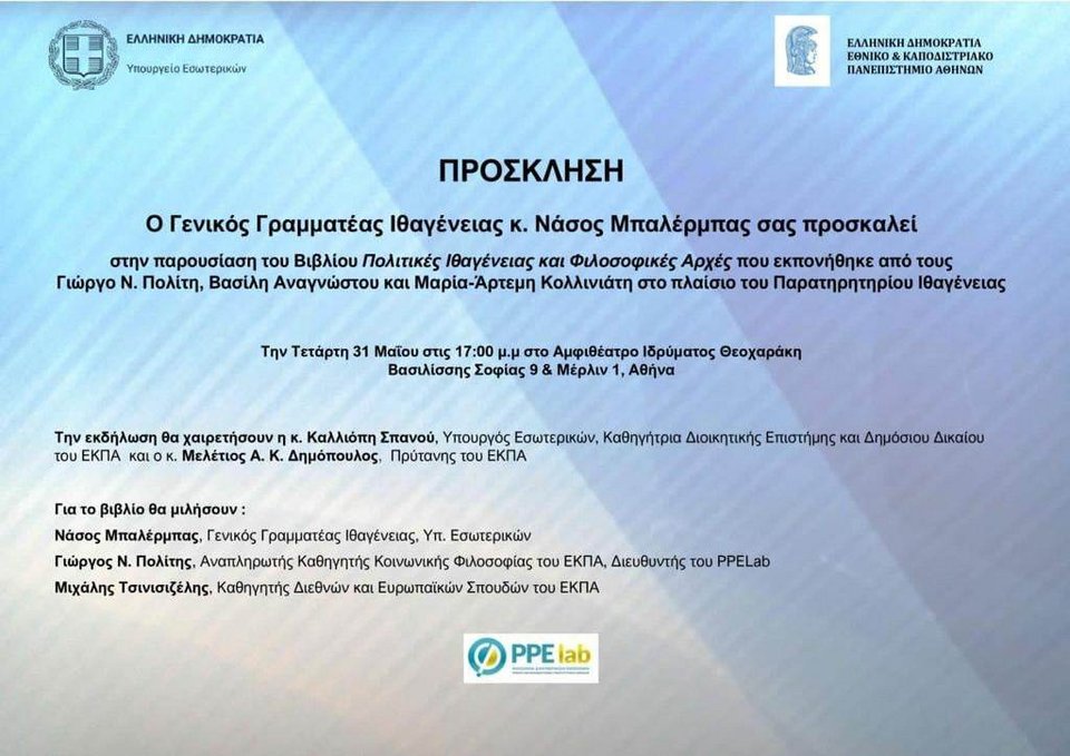 Στην παρουσιάση του βιβλίου «Πολιτικές Ιθαγένειας και Φιλοσοφικές Αρχές» που εκπονήθηκε από τους Γιώργο Ν. Πολίτη, Βασίλη Αναγνώστου και Μαρία - Άρτεμη Κολλινιάτη, θα μιλήσει η υπηρεσιακή υπουργός Εσωτερικών Καλλιόπη Σπανού.