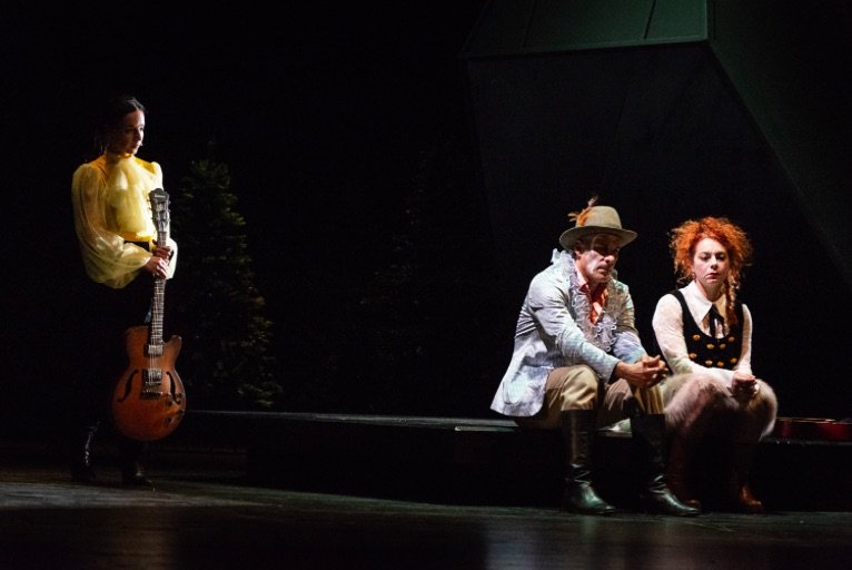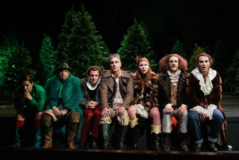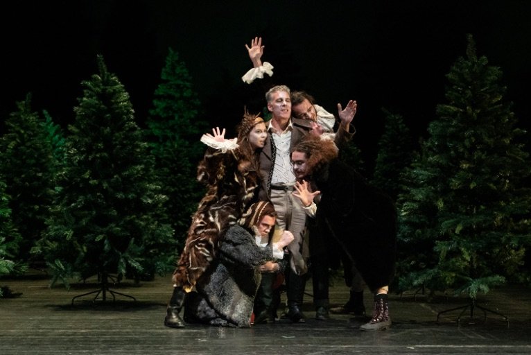 Μ’ άλλα λόγια οι ιδέες του έργου παραμένουν βωβές και οι ηθοποιοί αδυνατούν να καταστήσουν σαφή τα χαρακτηριστικά των προσώπων που υποδύονται ώστε να ενσαρκωθούν οι συγκρούσεις τους. Η σκηνογράφος (Μαρία Πανουργιά) αντιπαραθέτει τους, κατά Ρουσώ Ευγενείς Αγρίους (noble sauvage) με τους διεφθαρμένους, ραδιούργους αυλικούς, χωρίζοντας την σκηνή σε δύο μέρη: στα αριστερά, χριστουγεννιάτικα δέντρα προσδιορίζουν το δάσος στο οποίο βρίσκουν καταφύγιο οι παράνομοι. Στα δεξιά ένα κτίσμα παραπέμπει στο παλάτι.