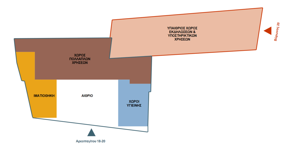Ο χώρος πολλαπλών χρήσεων χωροθετείται στο πίσω τμήμα του κτιρίου, έχοντας αυτοτέλεια και εκμεταλλευόμενος το άνοιγμα της στέγης, με θέα προς την Ακρόπολη.