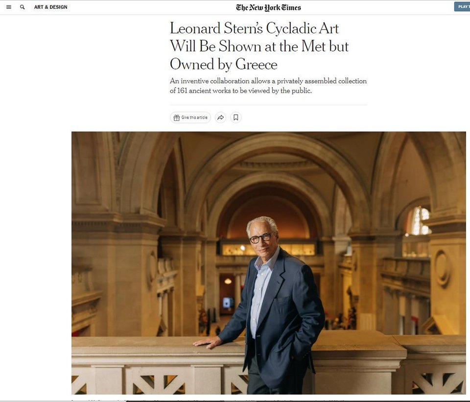 «Καινοφανή» χαρακτηρίζουν οι «New York Τimes» τη συμφωνία μεταξύ της ελληνικής κυβέρνησης, του Μητροπολιτικού Μουσείου της Νέας Υόρκης και του δισεκατομμυριούχου και φιλάνθρωπου Λέοναρντ Στερν.