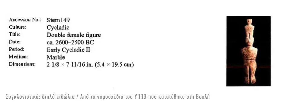 Σε περίπτωση μη δανεισμού της συλλογής εκ μέρους του Ελληνικού Κράτους προς το ΜΕΤ, για το διάστημα από την 1η.1.2049 και εφεξής, αποστολή με δαπάνες του ΜΕΤ και έκθεση στην ως άνω αίθουσα με την προαναφερθείσα ένδειξη και για περίοδο είκοσι πέντε (25) ετών από την 1η.1.2049, εκατόν είκοσι δύο (122) αρχαιοτήτων του Κυκλαδικού Πολιτισμού από τα μουσεία της Ελλάδας που θα αποστείλει τότε το Ελληνικό Κράτος στο ΜΕΤ», καταλήγει το κείμενο του νομοσχεδίου.