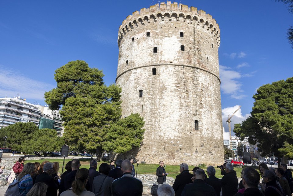 Σήμερα τιμούμε όχι μόνο ένα μνημείο φτιαγμένο από πέτρα και χρόνο, αλλά κι ένα ορόσημο των κινούμενων εικόνων, που γεφυρώνει την ιστορική κληρονομιά με την κινηματογραφική παρακαταθήκη. Ο Λευκός Πύργος, μέσα από την ποιητική ματιά του Θόδωρου Αγγελόπουλου, έγινε κάτι παραπάνω από ένα εμβληματικό μνημείο. Έγινε φορέας μνήμης και κιβωτός της ελληνικής ψυχής. Στον κινηματογράφο του Αγγελόπουλου ο Λευκός Πύργος υπερέβη τη λειτουργία του απλού φόντου, καθώς υπήρξε μάρτυρας της ιστορίας, της εξορίας, του αιώνιου ανθρώπινου δράματος, θυμίζοντάς μας τη μεταμορφωτική δύναμη του κινηματογράφου και τον τρόπο με τον οποίο διαφυλάσσει την εύθραυστη ισορροπία της μνήμης και της συλλογικής συνείδησης. Στην εποχή μας εξάλλου, περισσότερο από ποτέ άλλοτε, είναι ουσιαστικό να θυμόμαστε τις ιστορίες του παρελθόντος» υπογράμμισε. Ακολούθησαν οι τοποθετήσεις της Αθηνάς Καρτάλου και του Αναστάσιου Αντωνάρα, ενώ στη συνέχεια έγινε εκτενής αναδρομή στις ιστορικές καταβολές του Λευκού Πύργου και την πορεία του ανά τους αιώνες, φτάνοντας μέχρι τη σημερινή εποχή.
