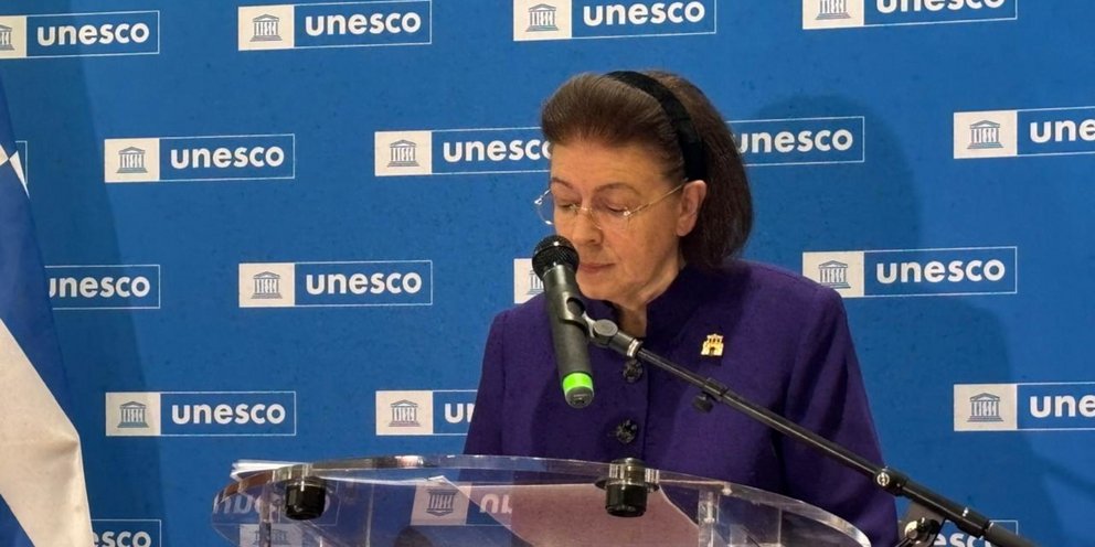 Η Υπ. Πολιτισμού Λίνα Μενδώνη εγκαινίασε στο Maison de l’UNESCO, στο Παρίσι, την αρχαιολογική έκθεση «Τη γλώσσα μου έδωσαν ελληνική» τίτλο εμπνευσμένο από το ποίημα «Άξιον Εστί» του Οδυσσέα Ελύτη.