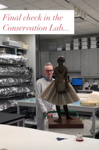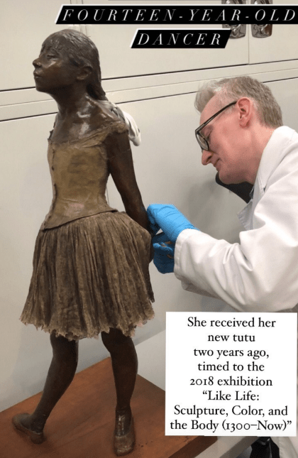 Το εικαστικό ενδιαφέρον, συναντά την τρυφερότητα, ακόμα και τη συγκίνηση στο βίντεο και τις αναρτήσεις που έκανε πρόσφατα το Metropolitan Μuseum της Νέας Υόρκης για να δείξει πώς άλλαξε φούστα στο περίφημο άγαλμα της δεκατετράχρονης χορεύτριας του Εντγκάρ Ντεγκά.