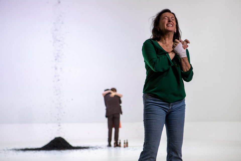 Στάχτη αρχίζει να πέφτει από τον ουρανό, σαν μια κορδέλα χωρίς τέλος που ξετυλίγεται και φτιάχνει έναν λοφίσκο στη σκηνή, στο κατάλευκο πάτωμα, του κατάλευκου σκηνικού που μοιάζει με το εσωτερικό ενός κύβου.