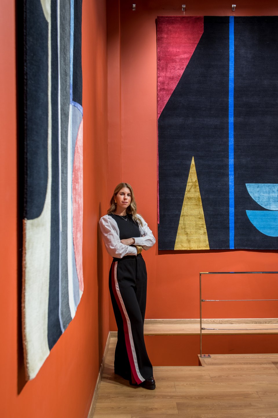 Η Ηλέκτρα Σουτζόγλου περνάει αρκετές μέρες της εβδομάδας μιλώντας με τους συνεργάτες του οίκου σε Ινδία, Πακιστάν, Νεπάλ για τη δημιουργία των έργων τέχνης. «Εμείς έχουμε το know how της δημιουργίας χαλιών. Ξέρουμε πώς μπορεί να μετασχηματιστεί το έργο, το σχέδιο, σε χαλί» μου εξηγεί ενώ τα μάτια μου είναι αδύνατον να αποτραβηχτούν από το στιλπνό έργο Green Interiors, με την κυριαρχία του πράσινου και το διαφορετικό σχήμα, που μου θυμίζει πολύ έργα του Γιάννη Μόραλη. «Τι σημαίνει αυτό; Τι υλικό θα βάλεις, τι ύφανση θα κάνεις, θα κάνεις carving; Συνήθως χρησιμοποιούμε 60% μετάξι, 40% μαλλί και σε κάποια σημεία μαλλί μαζί με μετάξι δημιουργώντας μια εντελώς νέα υφή. Εχουμε τη δική μας εργαλειοθήκη για να συζητήσουμε με τον καλλιτέχνη πως θα βγει πιο σωστό αυτό που έχει σχεδιάσει».