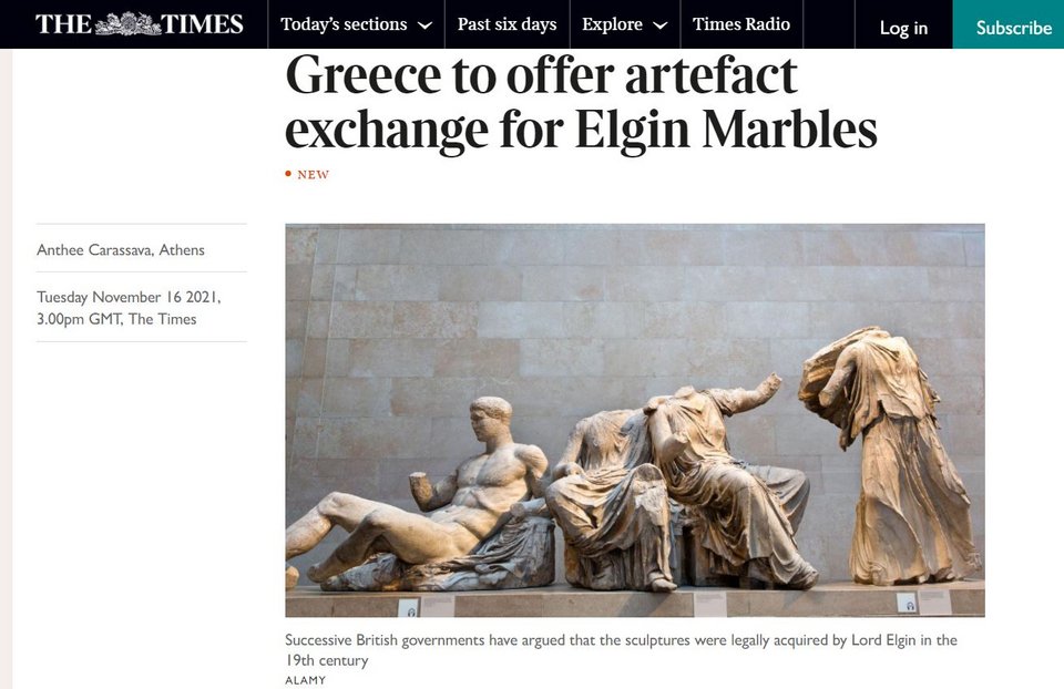 Εξωφρενικό ή αληθινό; Ενώ βρισκόταν ακόμα σε εξέλιξη η συνάντηση Μητσοτάκη-Τζόνσον, οι βρετανικοί «Times» αποκαλύπτουν ότι ο Έλληνας πρωθυπουργός θα προτείνει στον Βρετανό ομόλογό του, ως δάνειο, δύο σπουδαίες αρχαιότητες, με αντάλλαγμα την επιστροφή των Γλυπτών.