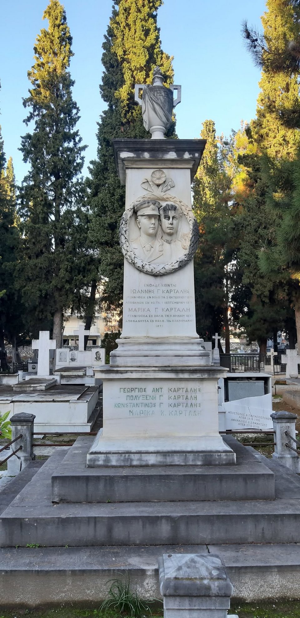 Η οικογένεια Καρτάλη όμως είχε ένα ακόμη ταφικό μνημείο όπου υπάρχει μία επιτύμβια στήλη με ένα εξαιρετικό γλυπτό που αποτυπώνει έναν άντρα και μία γυναίκα, με την επιγραφή «Ενθάδε κείνται Ιωάννης Γ. Καρτάλης, γεννηθείς εν Βόλω τη 5 Οκτωβρίου 1876. Αποθανών εν Κω, τη 1 Σεπτεμβρίου 1891. Μαρίκα Γ. Καρτάλη, γεννηθείσα εν Βόλω τη 14 Ιουλίου 1873, αποθανούσα εν Βόλο τω 14 Ιανουαρίου 1892».
