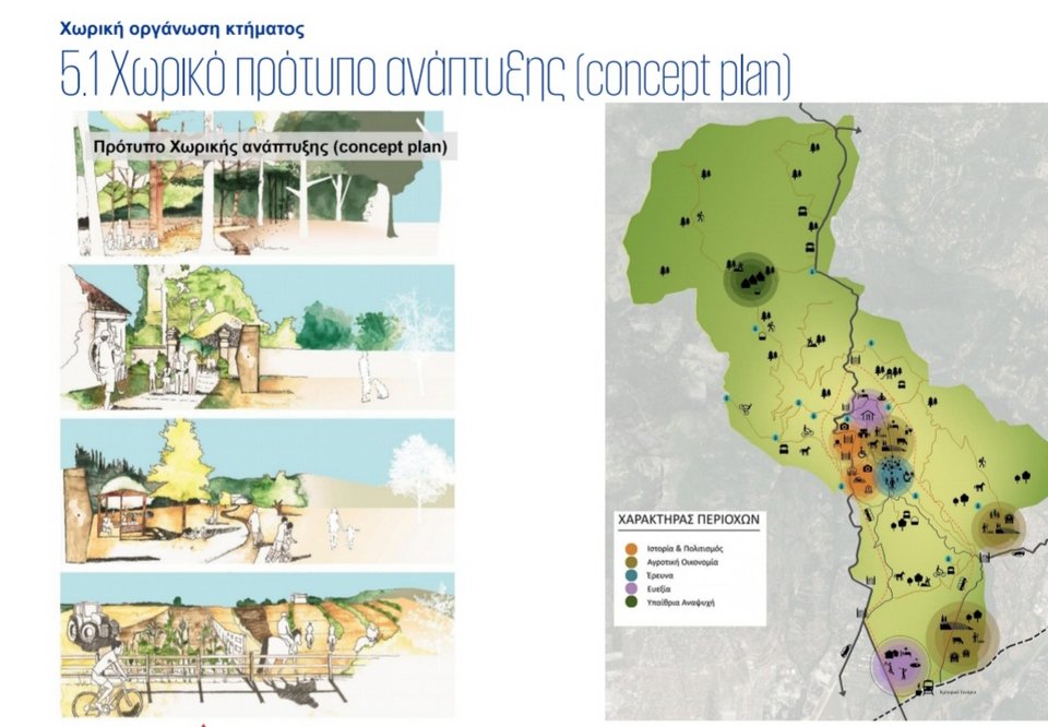 Αρχιτεκτονικά, οι παρεμβάσεις κινούνται στη λογική της ήπιας αποκατάστασης. Τα κτίρια στερεώνονται, αποκαθίστανται και προσαρμόζονται στις νέες χρήσεις χωρίς αλλοιώσεις του χαρακτήρα τους, με αυστηρή εποπτεία των υπηρεσιών του ΥΠΠΟ. Παράλληλα, προβλέπεται η σταδιακή αναβίωση του αγροτικού χαρακτήρα του κτήματος και η δημιουργία μεγάλου χώρου στάθμευσης εκτός πυρήνα, με εσωτερική μετακίνηση επισκεπτών.