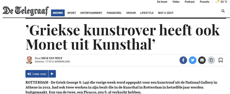 Ολο το προφίλ του πανέξυπνου και εμμονικά φιλότεχνου κλέφτη που άρπαξε μόνος τον Πικάσο και τον Μοντριάν από την Εθνική Πινακοθήκη γιατί ήθελε να έχει σπουδαία έργα στο σπίτι του, καταρρέει μπροστά στους ισχυρισμούς του Arthur Brand. Του ολλανδού ντετέκτιβ που ειδικεύεται στον εντοπισμό κλεμμένων έργων τέχνης -έχει εντοπίσει περισσότερα από 200- ο οποίος είχε στο ραντάρ του τον Γιώργο Σ., όπως εξηγεί με μια σειρά αποκαλυπτικών αναρτήσεων στο twitter.
