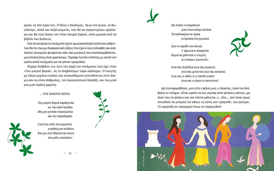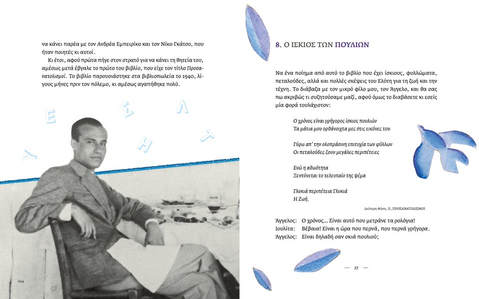 Με έναν τρόπο γραμμικό, γαλήνιο, μετρημένο σαν νότες σε παρτιτούρα, η Ιουλίτα Ηλιοπούλου ξετυλίγει την αφήγηση της ζωής του Ελύτη, εισάγοντας σταδιακά πληροφορίες για την ποίησή του, την κυρίαρχη εποχή, τη δύναμη της λογοτεχνίας. Μια απλή πληροφορία, ότι ο πατέρας του έγραφε ποίηση, κάνει εμάς, τους ενήλικους, ίσως όμως και τους μικρούς αμύητους, να δουν με ένα νέο φως την ποίηση του Ελύτη. Όπως το πόσο τον επηρέασε το βιβλίο του Πωλ Ελυάρ «Ο έρωτας, η ποίηση!». Η Ηλιοπούλου μας μιλά για τον υπερρεαλισμό, τι σημαίνει ρεύμα στις τέχνες, με έναν τρόπο ιδανικό για τα παιδιά. Τα οποία στο τέλος του βιβλίου θα βρουν ένα ολόκληρο παράρτημα με ασκήσεις, παιχνίδια, εργασίες που μπορούν να κάνουν για τον ποιητή.