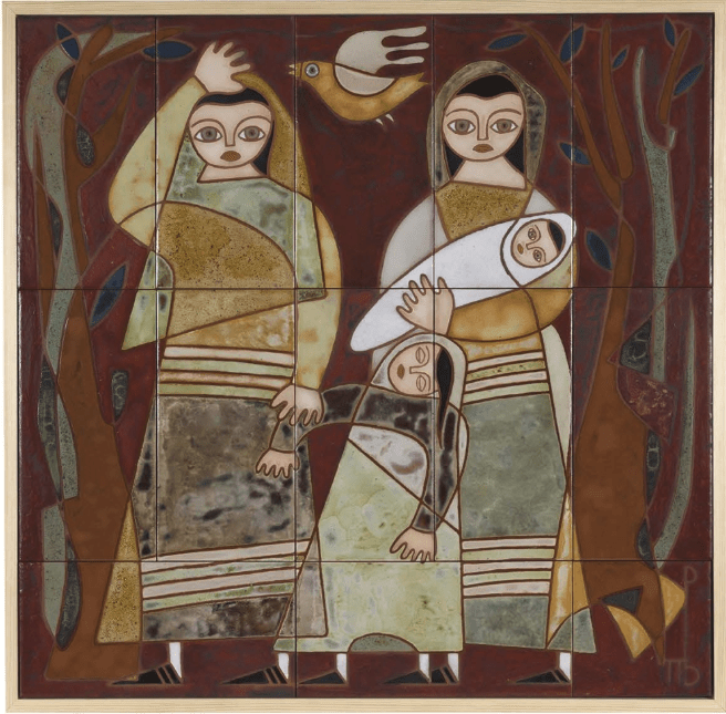 Εκεί, η κεραμική του Βαλσαμάκη εγκαταλείπει οριστικά τη λογική του αντικειμένου. Τα πλακίδια γίνονται μονάδες σύνθεσης. Η ζωγραφική περνά στον τοίχο. Οι μορφές επαναλαμβάνονται, μετασχηματίζονται, βαραίνουν. Ο ίδιος περιέγραψε αυτή τη μετάβαση με χαρακτηριστική ακρίβεια: «Το μικρό πλακίδιο που χωρούσε μία φιγούρα έγινε πανό και χώρεσε μία πολιτεία».