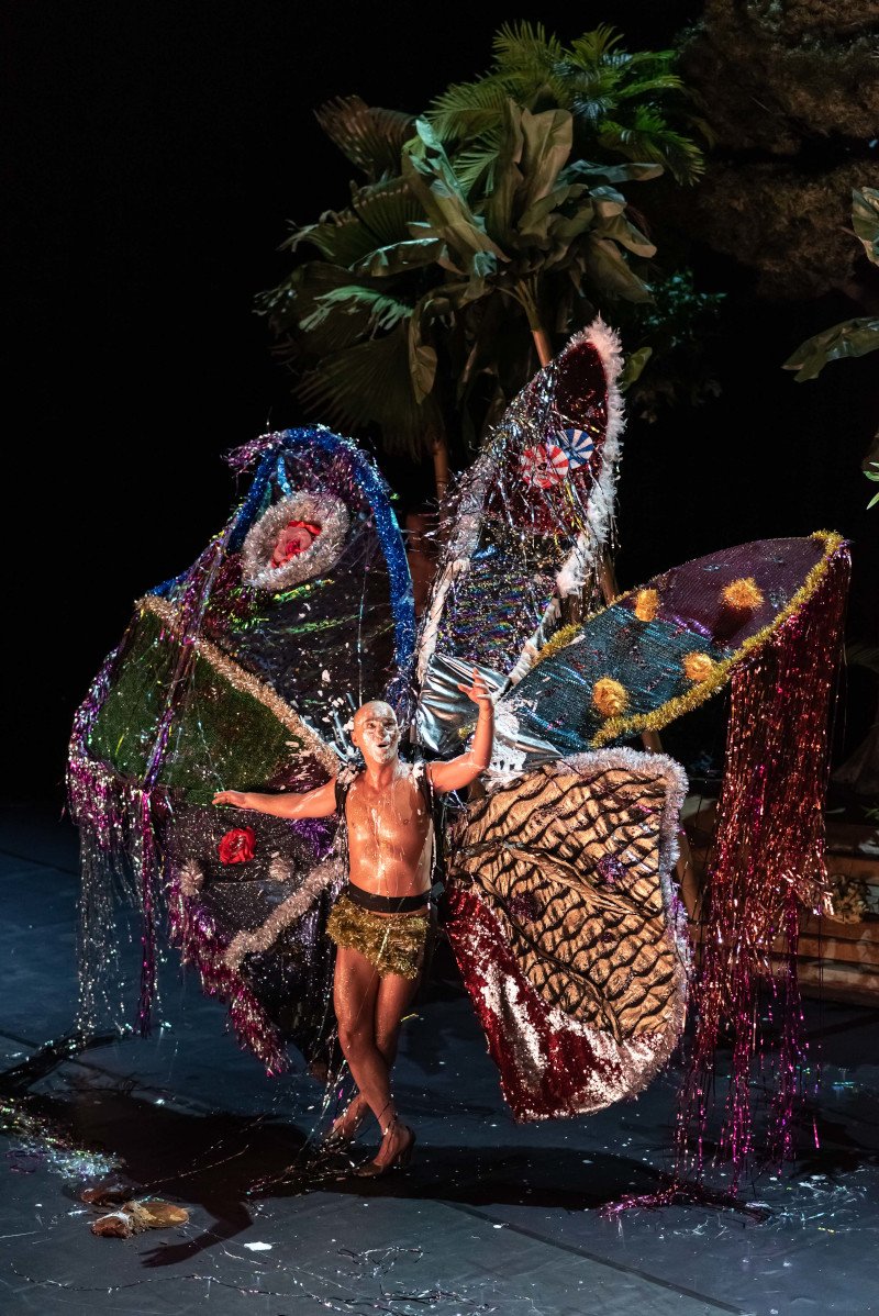Ονειρεύονται την ιδανική στιγμή οι δυο τους, ο καθένας τη δική του εκδοχή και η Ευελπίδη λέει ότι ευτυχία είναι τα διαλείμματα στο σχολείο – να είναι κολλημένη στα κάγκελα, να τσιμπολογά από το κολατσιό των παιδιών, να μην θέλει να τελειώσει το διάλειμμα. Ο Χρήστος Λούλης ως Εποπας, υπέροχη μορφή στα όρια του γκροτέσκου, μια γιαγιά από την ελληνική ενδοχώρα με μαντήλα και καμπούρα με την αρρενωπότητα να επανέρχεται από το κλασικό λευκό εσώρουχο, σε μια διαρκή σαρωτική κίνηση και μια φωνή που ώρες ώρες – στο κάλεσμα των πουλιών κυρίως- ένιωθες ότι έρχεται από τα έγκατα της γης. Αλλοτε ο ίδιος ως φωνή του Μουνκ, άλλοτε ο Ρωμαίος παραδομένος στην Αηδόνα εκφραστικά εξελίσσεται διαρκώς ως ο βασιλιάς που έγινε πουλί. Αριστουργηματική η Ιριδα του Θάνου Αλευρά, μια gender fluid μορφή αισθησιασμού και δύναμης, εξουσίας και ανέμελης ιδιοσυγκρασίας, αδύνατο να πάρεις τα μάτια από πάνω του. Με μια δύναμη διαρκή στη σκηνική του παρουσία.