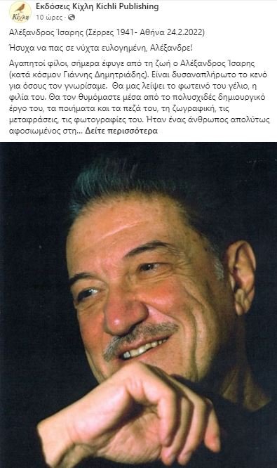 Αγαπητοί φίλοι, σήμερα έφυγε από τη ζωή ο Αλέξανδρος Ίσαρης (κατά κόσμον Γιάννης Δημητριάδης). Είναι δυσαναπλήρωτο το κενό για όσους τον γνωρίσαμε. Θα μας λείψει το φωτεινό του γέλιο, η φιλία του. Θα τον θυμόμαστε μέσα από το πολυσχιδές δημιουργικό έργο του, τα ποιήματα και τα πεζά του, τη ζωγραφική, τις μεταφράσεις, τις φωτογραφίες του. Ήταν ένας άνθρωπος απολύτως αφοσιωμένος στην Τέχνη.