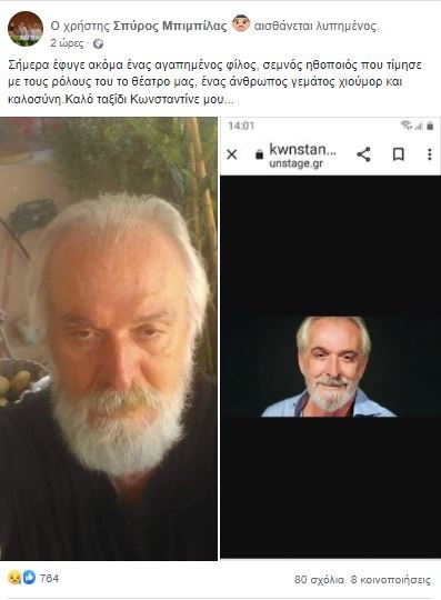 Ο πρόεδρος του ΣΕΗ Σπύρος Μπιμπίλας δημοσίευσε δύο φωτογραφίες του ηθοποιού Κωνσταντίνου Ζαμπάρα και έγραψε: «Σήμερα έφυγε ακόμα ένας αγαπημένος φίλος, σεμνός ηθοποιός που τίμησε με τους ρόλους του το θέατρο μας, ένας άνθρωπος γεμάτος χιούμορ και καλοσύνη. Καλό ταξίδι Κωνσταντίνε μου…».