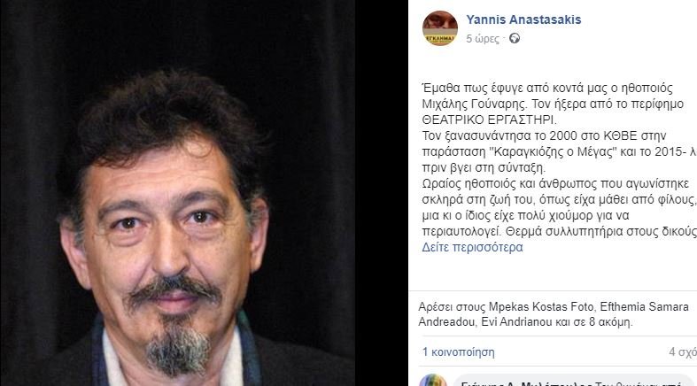 Την είδηση του θανάτου του έκανε γνωστή ο ηθοποιός και σκηνοθέτης Γιάννης Αναστασάκης με ανάρτησή του στο facebook.