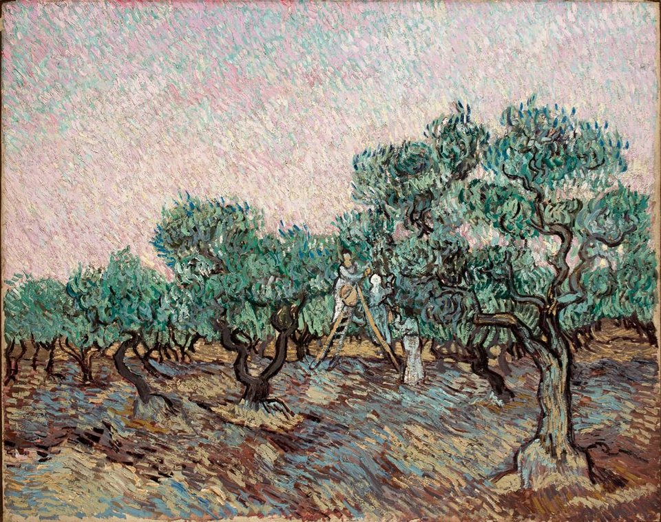 «Ο ψίθυρος της ελιάς έχει κάτι το πολύ προσωπικό, κάτι ιδιαιτέρως παλιό μέσα του», έγραφε στον αδελφό του μέσα από το άσυλο ο Βαν Γκογκ. Και ναι, είναι από τις περιπτώσεις που μέσα στον καμβά, μπορείς να δεις ολόκληρες αφηγήσεις που ξεπερνούν τη σύλληψη του καλλιτέχνη και βαθαίνουν στην ψυχοσύνθεση και τη ζωή του. Ο λόγος για την «Συγκομιδή της ελιάς» που ζωγράφισε ο Βαν Γκογκ μέσα στο άσυλο που νοσηλευόταν στη νότιο Γαλλία, ένα χρόνο ακριβώς μετά τον αυτοακρωτηριασμό μέρους του αριστερού του αυτιού. Η ψυχοσύνθεσή του, η κατάστασή του, η σχέση του με τον εαυτό του και τη φύση αποτυπώνονται σε αυτές τις μικρές, νευρικές, τέλειες πινελιές που συνθέτουν την εικόνα. Τον πίνακα αυτό που ζωγράφισε τον Δεκέμβριο του 1889, χώνοντας το καβαλέτο του μέσα στις λάσπες, στη συνέχεια αναπαρήγαγε από την ησυχία του του δωματίου του άλλες δυο φορές (τα αντίγραφα αυτά βρίσκονται σε Νέα Υόρκη και Ουάσιγκτον). Η πρώτη εκδοχή όμως, ανήκει στη Συλλογή Βασίλη και Ελίζας Γουλανδρή και έχουμε την σπάνια τύχη να την απολαμβάνουμε στον πρώτο όροφο του Μουσείου του Ιδρύματος Βασίλη και Ελίζας Γουανδρή στο Παγκράτι.