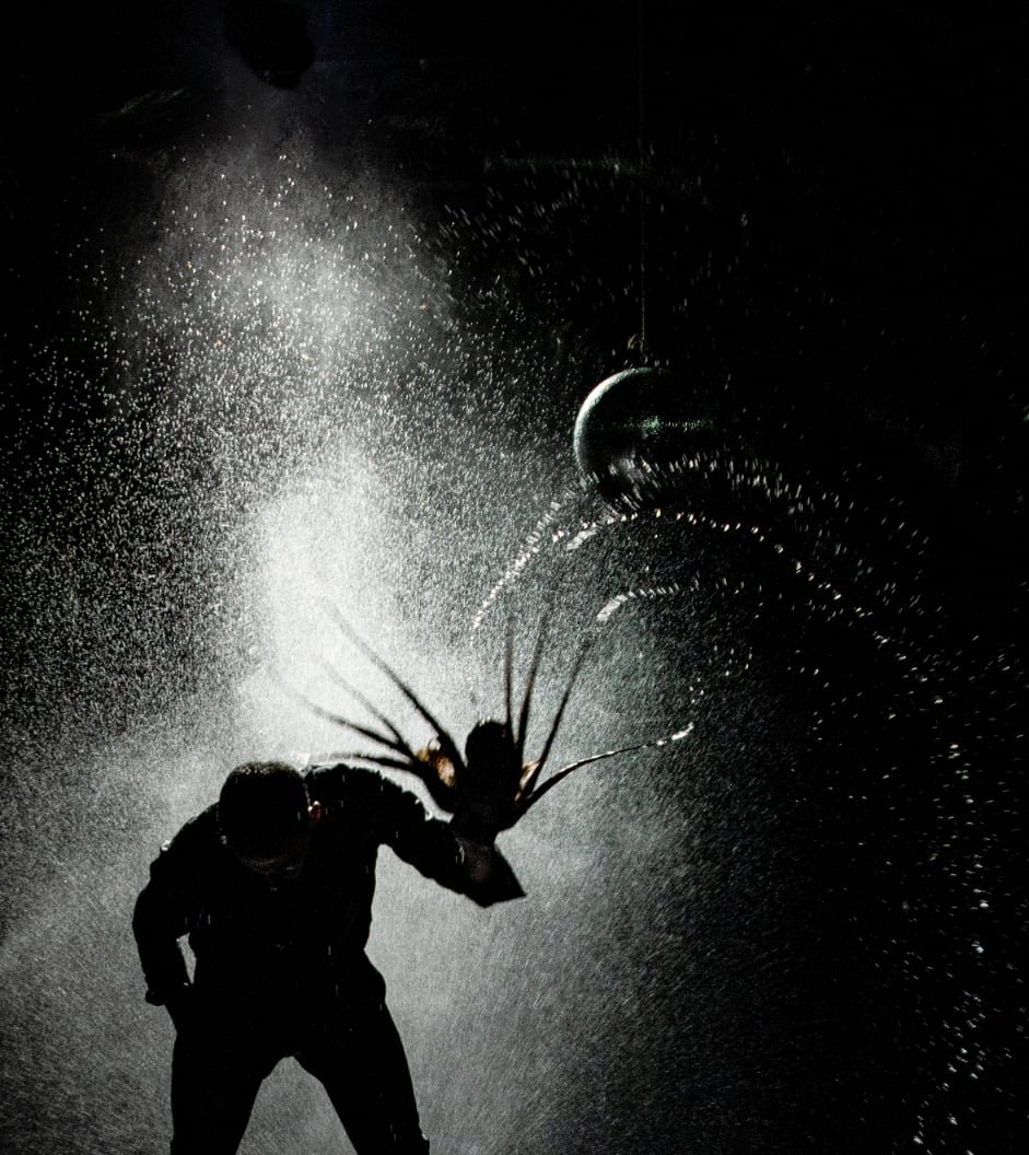 Ο Δημήτρης Παπαϊωάννου, μούσκεμα στη σκηνή, από το πρώτο δευτερόλεπτο, με ένα τεράστιο νάιλον να ορίζει τον τοίχο, τα όρια, ένα λάστιχο να πετάει νερό στη σκηνή και στο νάιλον παράγοντας ήχους και ένα χταπόδι στα χέρια του να πέφτει με δύναμη στο έδαφος. Εικόνα παιδικής ανάμνησης του δημιουργού -ένας ψαράς, σε έναν βράχο. Απόλυτη μοναξιά. Σαν κλεισμένος σε χώρο απομόνωσης, συντροφιά μόνο το νερό. Γεμίζει με το λάστιχο την γυάλα και το βλέμμα του χάνεται στο βάθος. Πώς περιμένεις να γεμίσει ένας κουβάς και δεν έχεις τίποτα να κάνεις και είναι σαν να σβήνεις μέσα σου, χωρίς σκέψεις, αδρανής για λίγα δευτερόλεπτα στον χρόνο. Αυτό το βλέμμα.