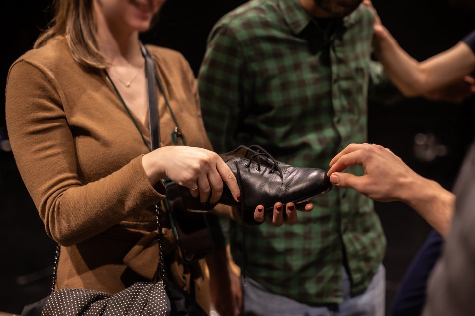 Δεν μπορώ να μη νιώσω δέος. «Ανυπομονούμε να χορέψουμε για εσάς». Τα άτομα με αναπηρία όρασης, αφού ακούσουν την περιγραφή του σκηνικού χώρου, οδηγούνται να αγγίξουν τα αντικείμενα: το στόρι που παράγει τον ήχο όταν ο Γιώργος ξεκουμπώνει το φερμουάρ του μπουφάν του στην παράσταση. Τις καρύδες που χτυπά στο πάτωμα και ακούγονται σαν οπλές αλόγου που άλλοτε καλπάζει, άλλοτε ξεμακραίνει. Γονατίζουν τα άτομα με αναπηρία ακοής να πιάσουν τις καρύδες που παράγουν τους ήχους που θα ακουστούν, εισπράττουν όλο τον μηχανισμό της κίνησης και της δημιουργίας του ήχου.