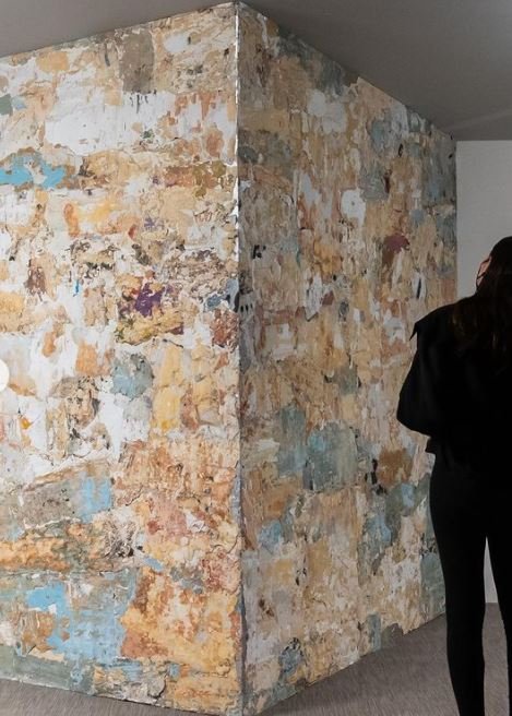 Σπαράγματα από τους τοίχους του κτιρίου στις οδούς Βρυάξιδος 11 και Ασπασίας στο Παγκράτι που πλέον έχει γκρεμιστεί, ανασυντέθηκαν με τον μοναδικό τρόπο της Ρένας Παπασπύρου και δημιούργησαν έναν γωνιακό τοίχο που εκτίθεται πλέον στη Στέγη του Ιδρύματος Ωνάση.