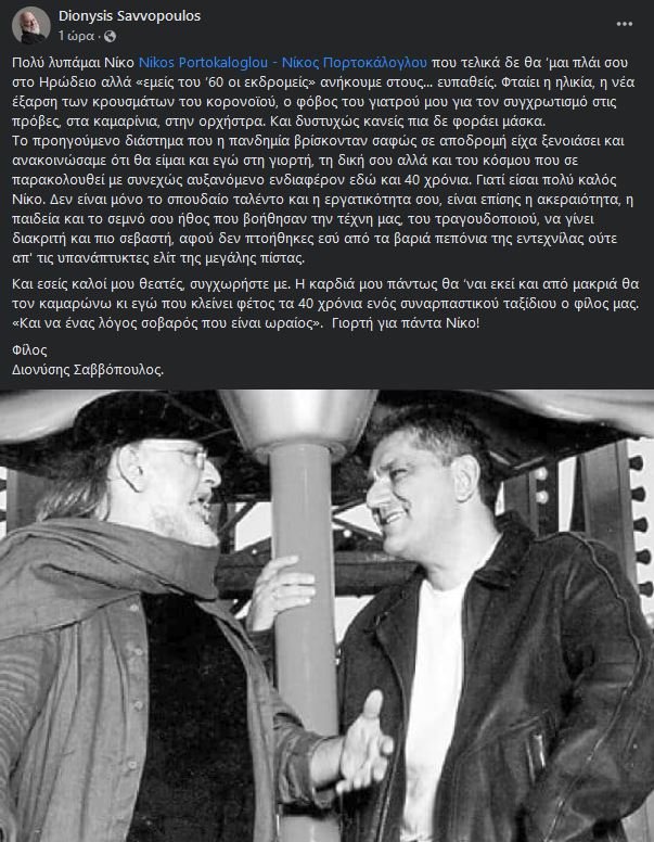 Ο Διονύσης Σαββόπουλος ανακοίνωσε ότι δεν θα πάει τελικά στη συναυλία του Νίκου Πορτοκάλογλου, υπό τον φόβο του κορωνοϊού και της νέας έξαρσης κρουσμάτων.