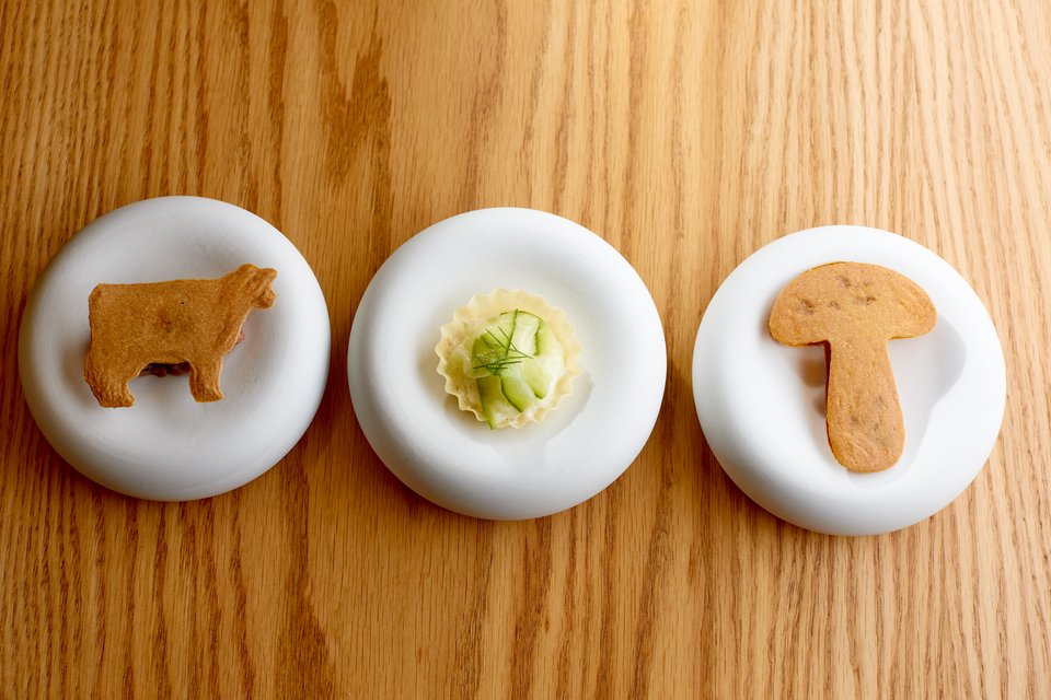 Τον ρωτάω για το ψωμί, που είναι ένας δείκτης για το πόσο επιτυχημένη είναι μια κουζίνα, κατά τη γνώμη μου. «Συμφωνώ ότι είναι σημαντικό το ψωμί», μου λέει. «Το δικό μας είναι ένα πολύ ιδιαίτερο μπριός γιατί έχει ένα συγκεκριμένο μυστικό χαρακτηριστικό. Το συνοδεύουμε με αφρατεμένο βούτυρο». Ανυπομονεί να αρχίσει να κάνει τις δικές του παλαιώσεις, ενώ επειδή δεν τρώει ο ίδιος τα γλυκά, έχει περιοριστεί σε μια ημίγλυκη πανακότα με κατσικίσιο τυρί (να το στοιχείο της παλαίωσης), με αφρό από γάλα, σαμπλέ μπρετόν και μαρμελάδα από κόκκινα φρούτα.