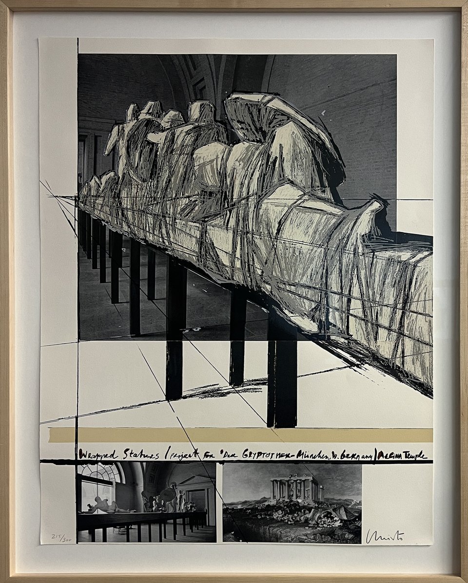 Το έργο του Christo είναι ασημοτυπία με φωτοκολάζ, έχει διάσταση 90 επί 69 εκατοστά και είναι υπογεγραμμένο. Το έργο που ήταν πρόταση που ποτέ δεν υλοποιήθηκε βέβαια, παρουσιάστηκε στην Γλυπτοθήκη του Μονάχου το 1991 και δεν είναι μια απλή άσκηση, αφού όντως υπήρχε η σκέψη να τυλιχθούν μαζί με άλλες δυο γλυπτικές συνθέσεις που στεγάζονται στο μουσείο. Ερευνητική αρχαιολογική ομάδα Γερμανών φέρονται να εντόπισαν τον ναό Αφαίας στην Αίγινα το 1811, και ένα χρόνο μετά ο Martin von Wagner τα αγόρασε σε δημοπρασία για λογαριασμό του Λουδοβίκου Α' της Βαυαρίας 17 γλυπτά, τους γνωστούς Αιγινήτες Πολεμιστές του Τρωικού Πολέμου. Από το 1827 πέρασαν στην ιδιοκτησία της Γλυπτοθήκης του Μονάχου.