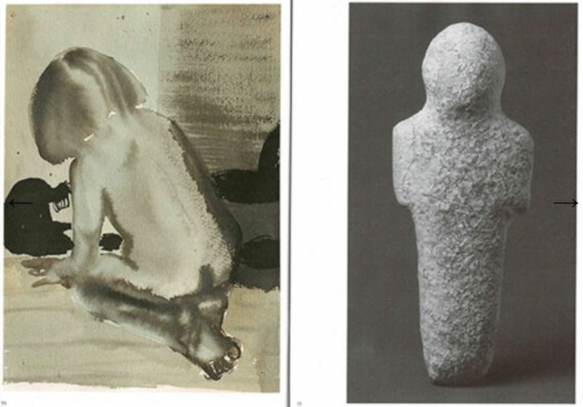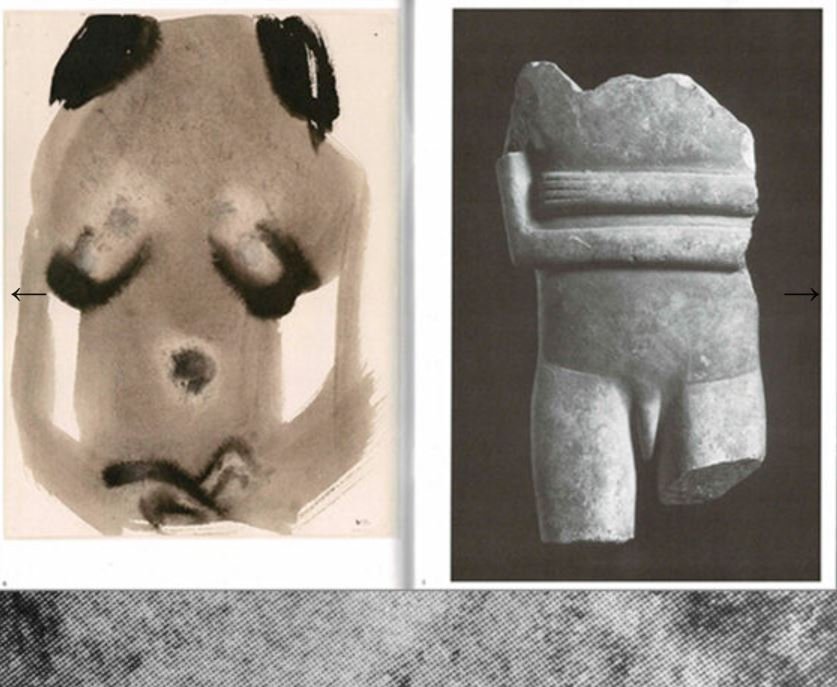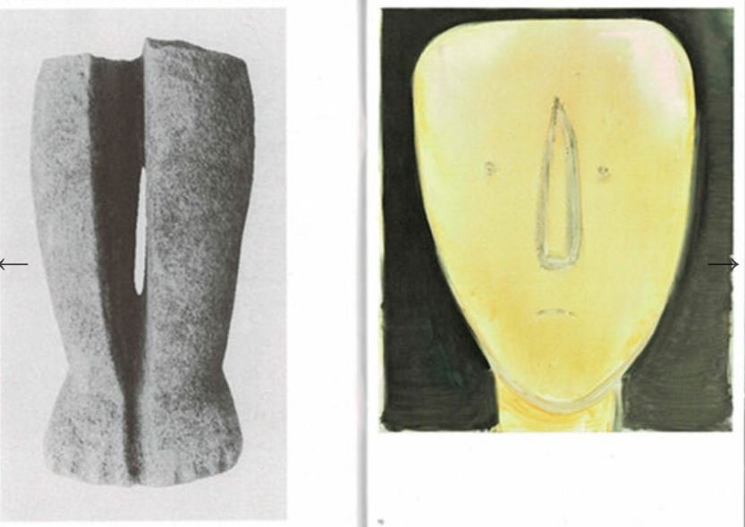 Ξεφυλλίζω την έκδοση που βγήκε σε συνεργασία με τον ΝΕΟΝ και του Μουσείο Κυκλαδικής Τέχνης και ανακάλυψα στο Hyper Hypo στην οδό Βορέος, και είναι αδύνατο σαν σε κάθε σελίδα να βλέπω καθρεπτισμούς των κυκλαδικών γλυπτών. Μια μαρμάρινη λεκάνη και μια προχυτική λεκάνη απέναντι σε έναν κορμό σώματος -οι καμπύλες, οι κοιλότητες, η επιφάνεια του δέρματος στο κάτοπτρο της Ντουμά.