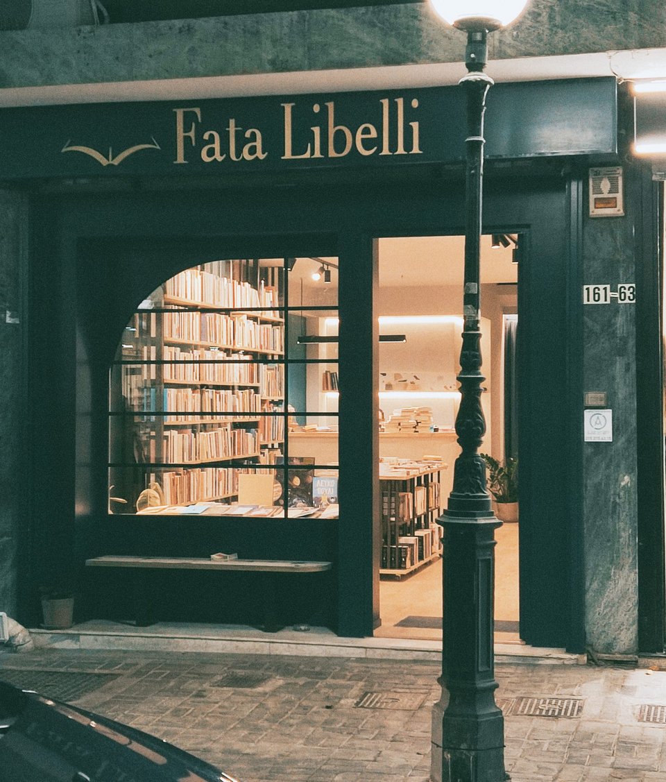 Στην οδό Πραξιτέλους, το βιβλιοπωλείο Fata Libelli είναι γεμάτο κόσμο. Στον πάγκο απ’ έξω ξαποσταίνουν κάποιοι πριν μπουν μέσα στον χώρο, με τις βαριές μπλε βελούδινες κουρτίνες στο βάθος και την κλασική μουσική να ακούγεται διακριτικά.