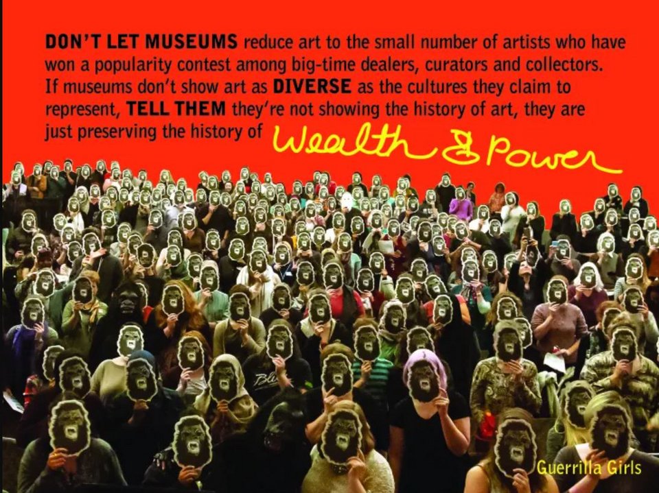 Όμως αυτό που έχει ξεχωριστό ενδιαφέρον είναι ότι συνοδεύουν τα περισσότερα έργα τους με ειδικές λεζάντες, ουσιαστικά κείμενα που εμβαθύνουν στην παρέμβασή τους και είναι όλες γραμμένες από τα Guerrilla Girls. Η έκθεση είναι οργανωμένη σε τρεις ενότητες, αλλά όχι χρονολογικά. Στην πρώτη εντοπίζουμε την έναρξη της δουλειάς τους που αφορά στην χαμηλή εκπροσώπηση των γυναικών στα μουσεία, αλλά και τον τρόπο που η γυναίκα προβάλλεται μέσα στην τέχνη των μουσείων με την ματιά και τον δημιουργικό τρόπο ανδρών καλλιτεχνών.