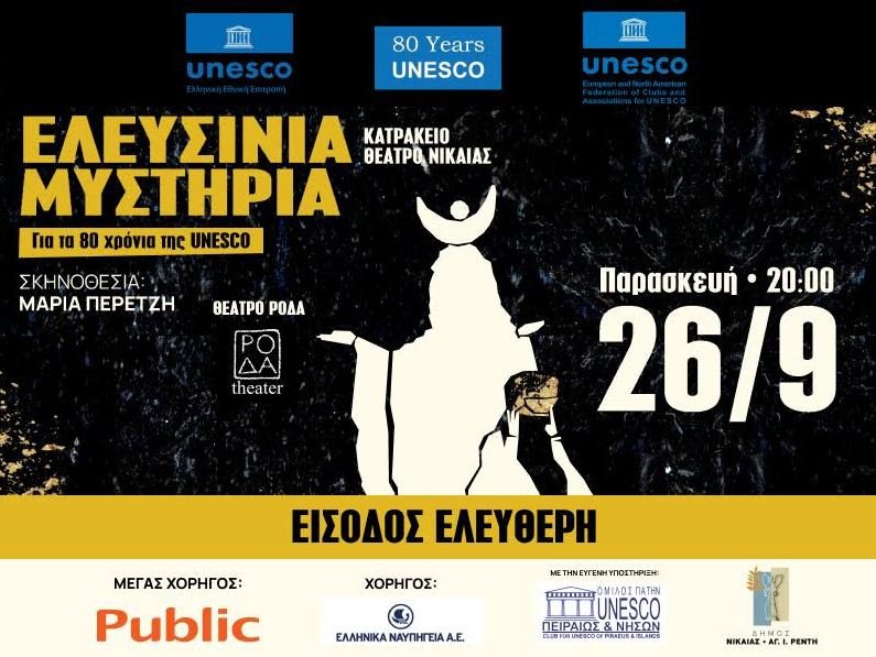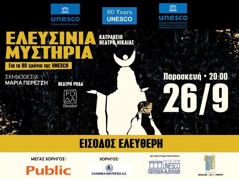 Η παράσταση θα παρουσιαστεί την Παρασκευή 26 Σεπτεμβρίου 2025, στις 20:00, στο Κατράκειο Θέατρο Νίκαιας, με ελεύθερη είσοδο για το κοινό, στο πλαίσιο του εορτασμού για τα 80 χρόνια από την ίδρυση της UNESCO. Τη διοργάνωση έχουν αναλάβει η Ελληνική Εθνική Επιτροπή για την UNESCO και η Ομοσπονδία Ομίλων & Συλλόγων για την UNESCO Ευρώπης και Βορείου Αμερικής. Πρόκειται για μια θεατρική υπερπαραγωγή σε σκηνοθεσία Μαρίας Περετζή και τη βραβευμένη θεατρική ομάδα ΡΟΔΑ, που θα αναβιώσει τη μυσταγωγική ατμόσφαιρα της σπουδαιότερης τελετουργίας της αρχαιότητας, προσκαλώντας το κοινό σε ένα μοναδικό ταξίδι στον μύθο, την ιστορία και την παράδοση.
