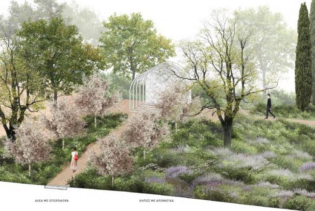 Στην περιοχή του μικρού Θερμοκηπίου προτείνεται μικρότερης κλίμακας αλέα από οπωροφόρα όπως κερασιές ή βυσσινιές, και κήπος με αρωματικά φυτά.