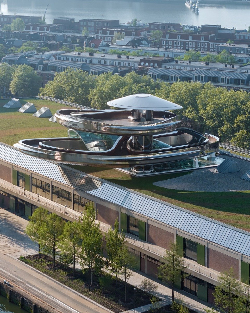 Στην κορυφή, σε υποδέχεται μια σαρωτική θέα στους ιστορικούς προβλήτες — ένα διαχρονικό σημείο αναχωρήσεων και αφίξεων. Από εκεί ξεκίνησαν εκατομμύρια άνθρωποι, αναζητώντας μια νέα ζωή. Πλοία μετανάστευσης απέπλεαν από αυτές τις ακτές με προορισμό τις Ηνωμένες Πολιτείες και τον Καναδά. Την ίδια στιγμή, πλήθη ανθρώπων έφταναν στο Ρότερνταμ, διαμορφώνοντας την πόλη όπως τη γνωρίζουμε σήμερα. Παρόλο που ο Tornado έχει έναν φουτουριστικό σχεδιασμό, η βάση του είναι βαθιά ριζωμένη στην εκατοντάχρονη αποθήκη και στην ιστορία της περιοχής.