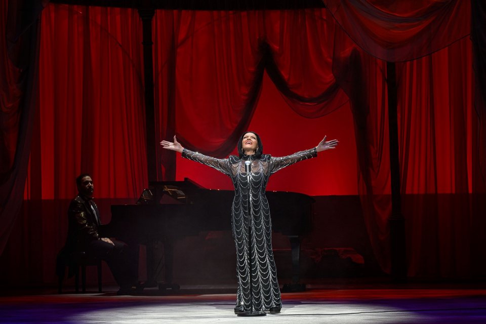 Η Ζωζώ Σαπουντζάκη, σταρ και στην πρόβα, φωτογραφίζεται τραγουδώντας στη σκηνή.