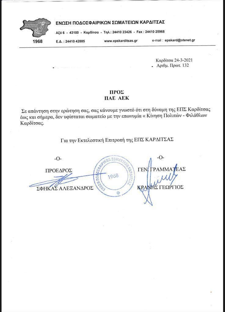 Μάλιστα υπάρχει και επίσημο έγγραφο από την ΕΠΣ Καρδίτσας, που δίνει δίκιο στην ΠΑΕ ΑΕΚ αφού πρόκειται για σωματείο που δεν ανήκει στην δύναμή της.