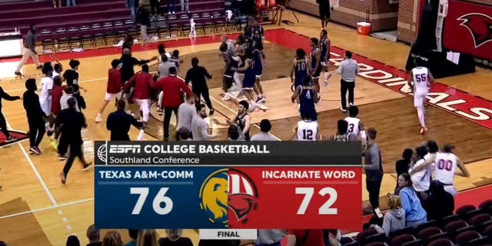 Ένας άγριος καβγάς ξέσπασε μετά την επικράτηση των Texas A&M Commerce επί των Incarnate Word με 76-72 στην παράταση το βράδυ της Δευτέρας.