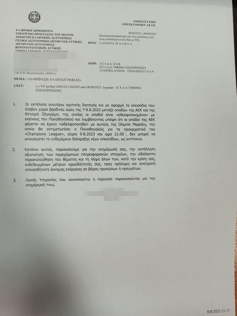 Έγγραφο που αποκάλυψε και δημοσίευσε χθες το iefimerida.gr, φανερώνει πως στην ΕΛ.ΑΣ φοβούνται για νέο κύκλο επεισοδίων με αφορμή το ματς για τα προκριματικά του Champions League μεταξύ Παναθηναϊκού και Μαρσέιγ.
