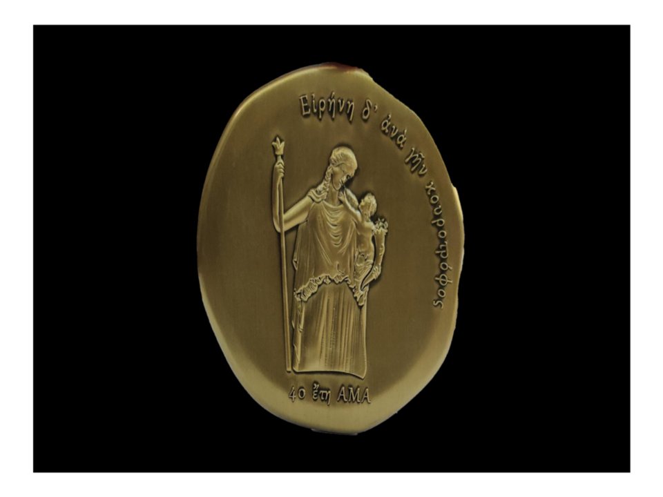 Η Ειρήνη λατρεύτηκε ως θεά στην αρχαιότητα. Στο μετάλλιο απεικονίζεται αναπαράσταση του αγάλματός της που δέσποζε στην Αρχαία Αγορά της Αθήνας, να κρατά τον μικρό Πλούτο κι αυτός το Κέρας της Αμάλθειας, σύμβολο της αφθονίας.