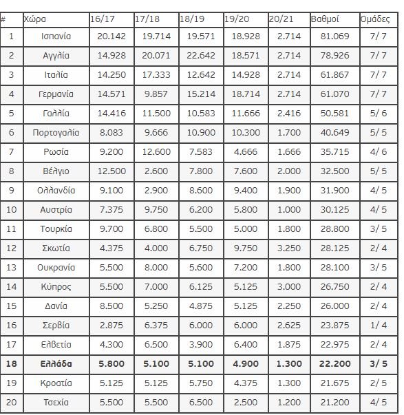 Η Ελλάδα παραμένει στην 18η θέση της βαθμολογίας της UEFA.