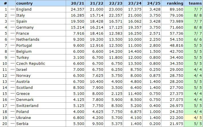Η νίκη του ΠΑΟΚ έδωσε 250 βαθμούς στην χώρα μας, η οποία βρέθηκε στους 27.625. Ελάχιστα πιο μπροστά είναι η Σκωτία και στη 13η θέση η Αυστρία (28.400 βαθμούς).