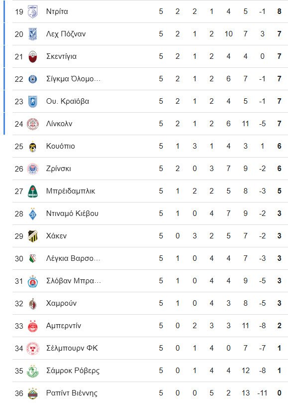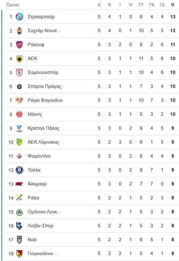 Οι οκτώ ομάδες που έχουν εξασφαλίσει ευρωπαϊκή συνέχεια («16» ή playoffs) στο Conference League: Στρασμπούρ (Γαλλία/στους «16»), ΑΕΚ, Μάιντς (Γερμανία), Ράκοβ (Πολωνία), Ράγιο Βαγιεκάνο (Ισπανία), Σαμσούνσπορ (Τουρκία), Σαχτάρ (Ουκρανία), Σπάρτα Πράχας (Τσεχία).