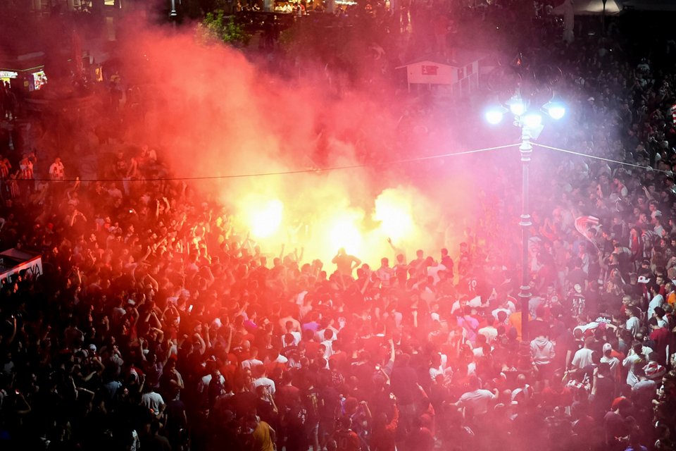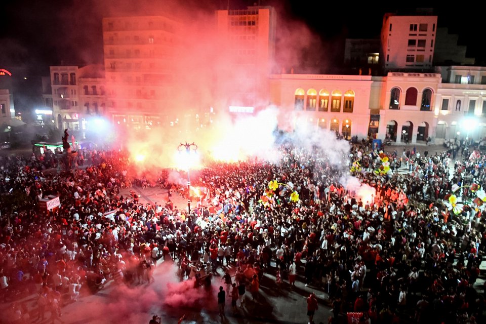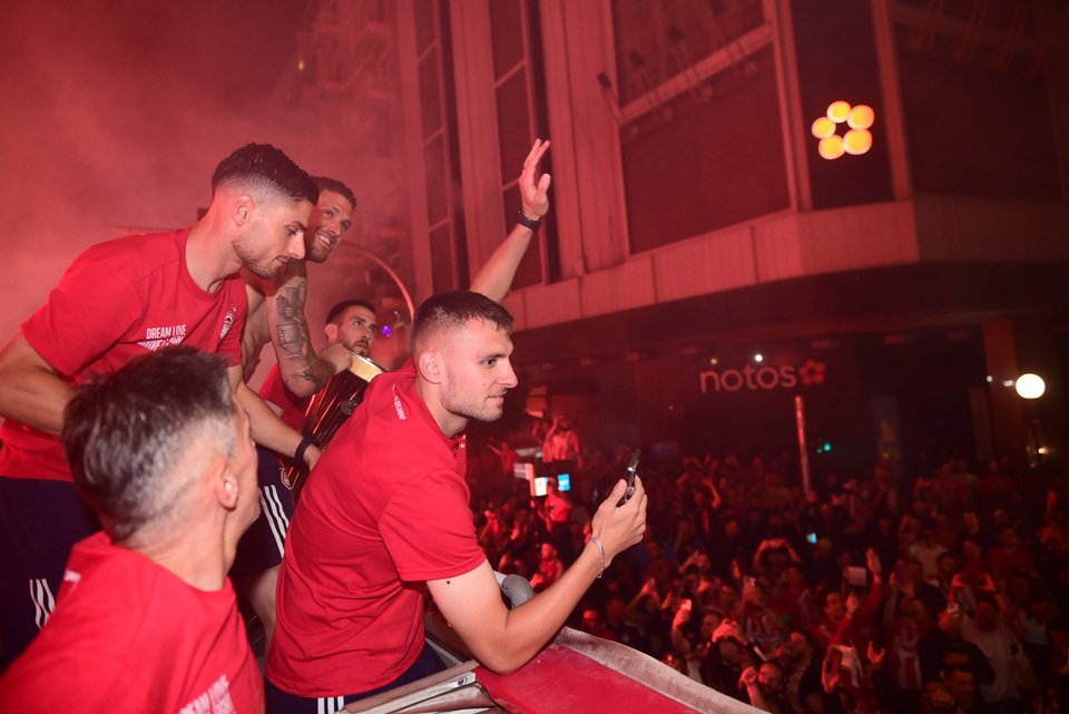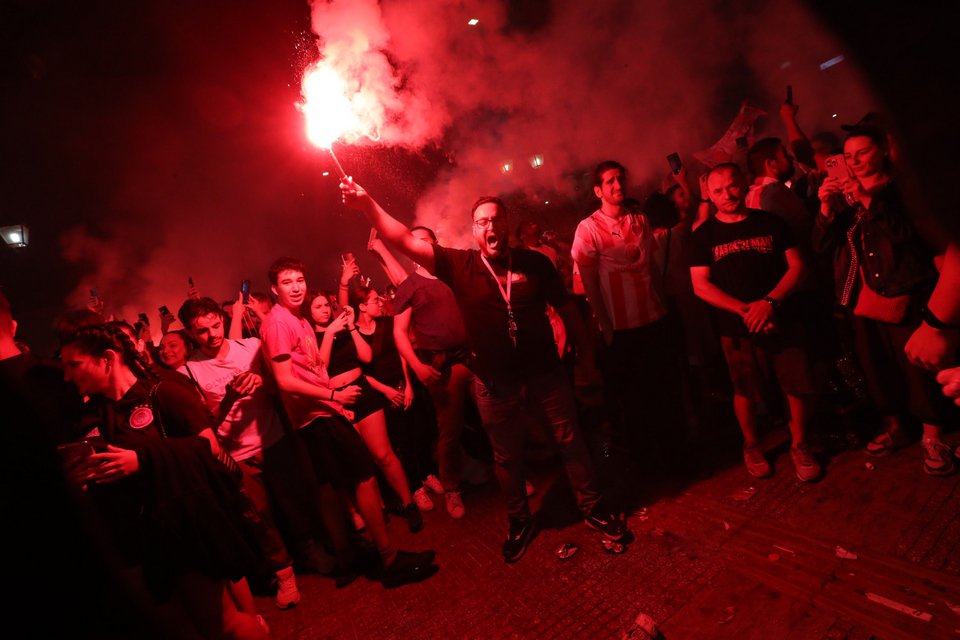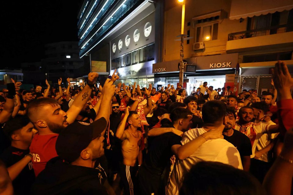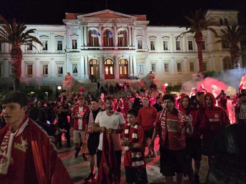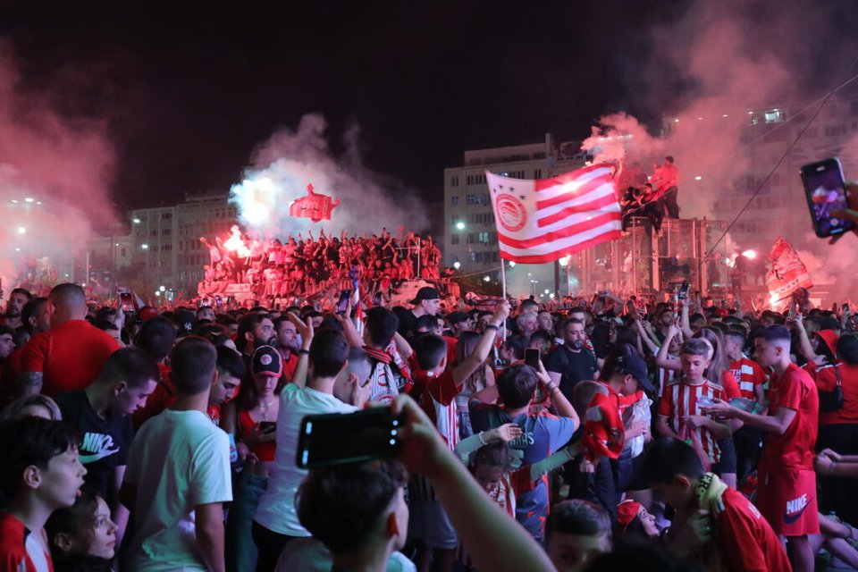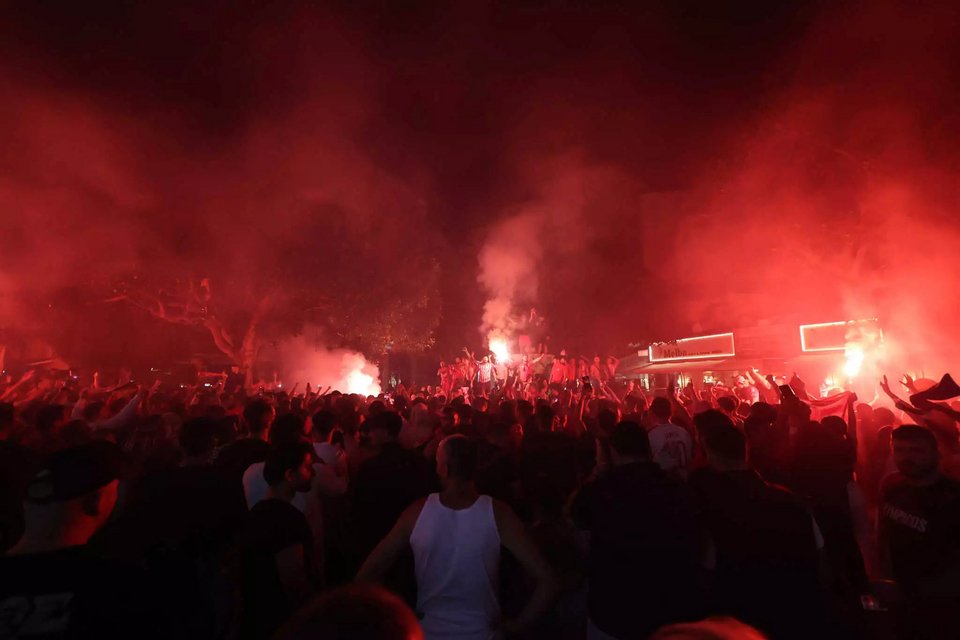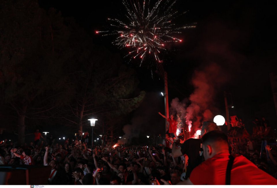 Χιλιάδες υποστηρικτές των «ερυθρολεύκων» κατέβηκαν στο κέντρο της πόλης αλλά και στην παραλία, κρατώντας σημαίες και κασκόλ της ομάδας τους φωνάζοντας συνθήματα.